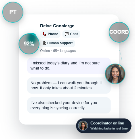 Technology can remind. Humans get results. Delve’s concierges watch study activity in real time and step in the moment a participant drifts—protecting compliance before it becomes a deviation or a dropout.
