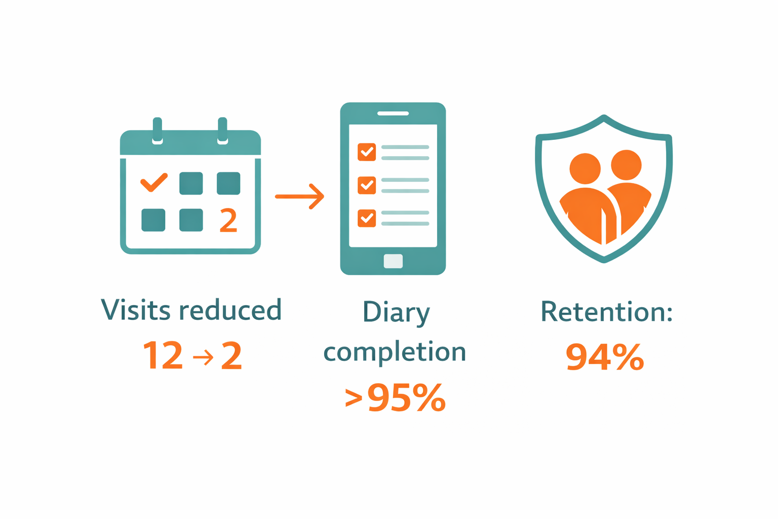 Visits reduced 12 → 2. Diary completion > 95%. Retention: 94%.