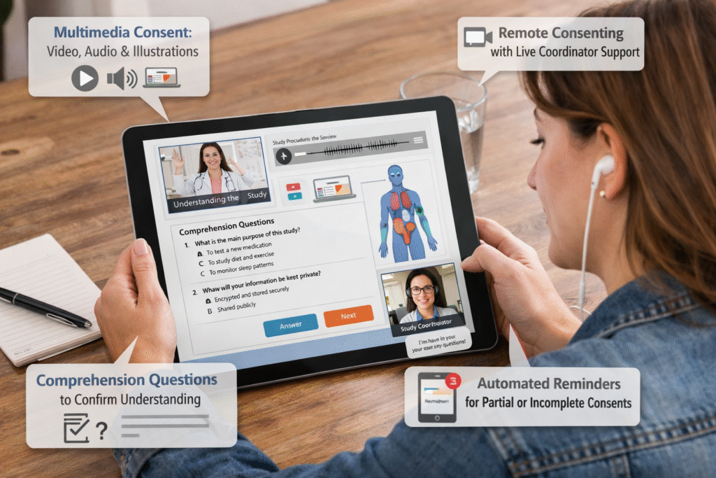 Empower patients with clear, multimedia-guided consent they can understand. Built for global enrollment, hybrid trials, and real-time oversight—without adding burden to sites.